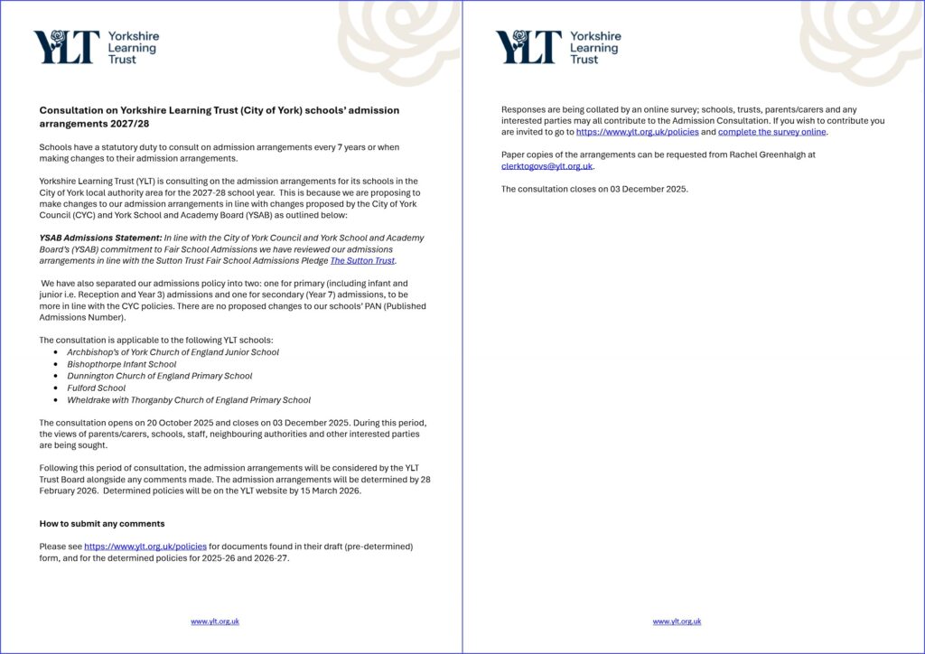 Please see below information about the Yorkshire Learning Trust consultation regarding admissions into the 2027-2028 academic year.