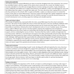 This focuses on the effect that the Christian ethos of the school has on the children and young people who attend it. Church schools will employ a variety of strategies and styles, which reflect their particular local context or church tradition in order to be distinctive and effective and the principal objective of SIAMS inspection is to evaluate the distinctiveness and effectiveness of the school as a church school.